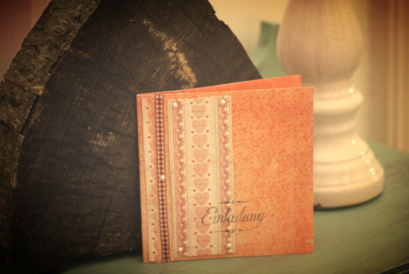 Beschreibung: Die Einladung besteht aus einem hochwertigen, stabilen sowie beidseitig bedrucktem Einladungspapier. Mascherl, Spitze, Stempel und Perlen verzieren die Außenseite.