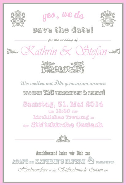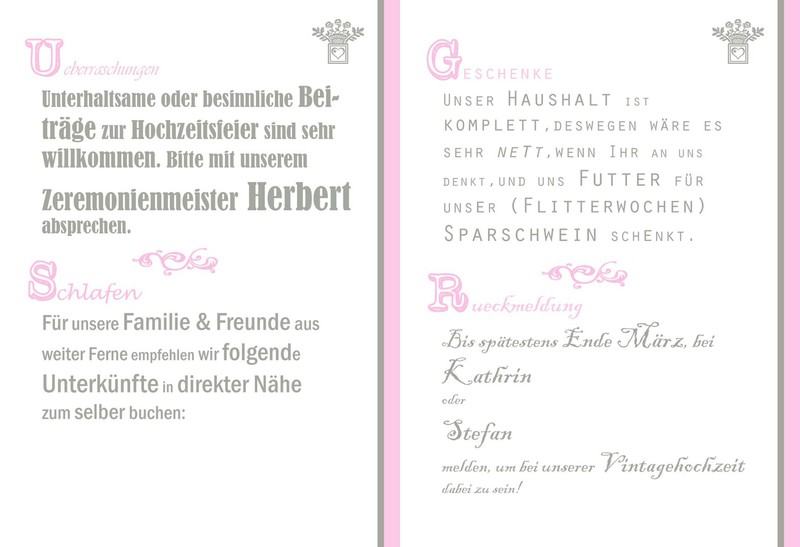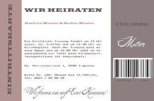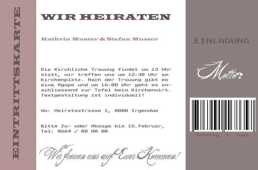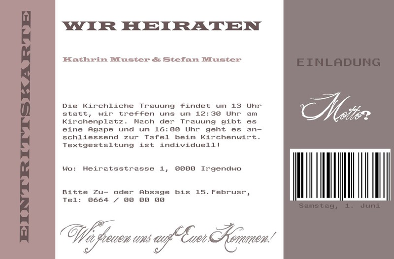 Beschreibung: Der Text ist wie eine Eintrittskarte zu Eurer Hochzeit gestaltet. Die Farbe des Layouts passt sich wieder an Euer Farbkozept an.