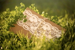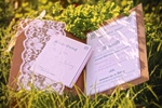Beschreibung: Die Einladung besteht aus Kartonpapier, Innenseite gerillt, Außenseite glatt. Außerdem wird echte Spitze verwendet. Zwei Bänder und eine Perle verzieren die Außenansicht der romantisch verspielten Einladungskarte.